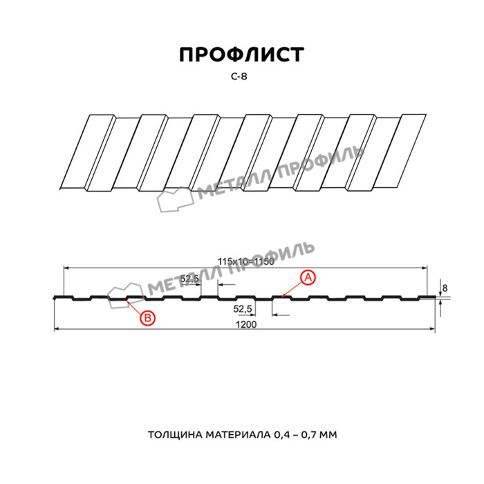 Профиль с наиболее маленькой волной в каталоге Компании Металл Профиль. Его назначение – в большей степени дизайнерская функция, нежели прочностная. Этот профнастил замечательно решает такие задачи, как: системы подвесных потолков, постройка ограждений, не подверженных большим снеговым и ветровым нагрузкам, создание вентилируемых фасадов, внутренняя отделка индустриальных помещений. Одинаковая с обеих сторон форма профиля делает С-8 универсальным материалом для разнообразных дизайнерских проектов. Оптимальная толщина металла – от 0,4 до 0,7 мм даёт возможность профнастилу отлично справляться с любым своим назначением. А большая полезная ширина (1150 мм) помогает сэкономить на закупке профлистов. По вашему заказу мы можем изготовить листы металлопроката длиной от 0,5 до 12 метров.