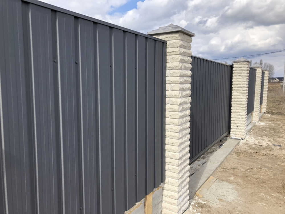 Популярное бюджетное решение для ограждающих конструкций. Профнастил и стальной штакетник в двустороннем покрытии Полиэстер (матовый) красиво выглядят с внешней и изнаночной стороны. Ограждение из такого материала не горит, не гниёт, его не надо красить и защищать от древоточцев.