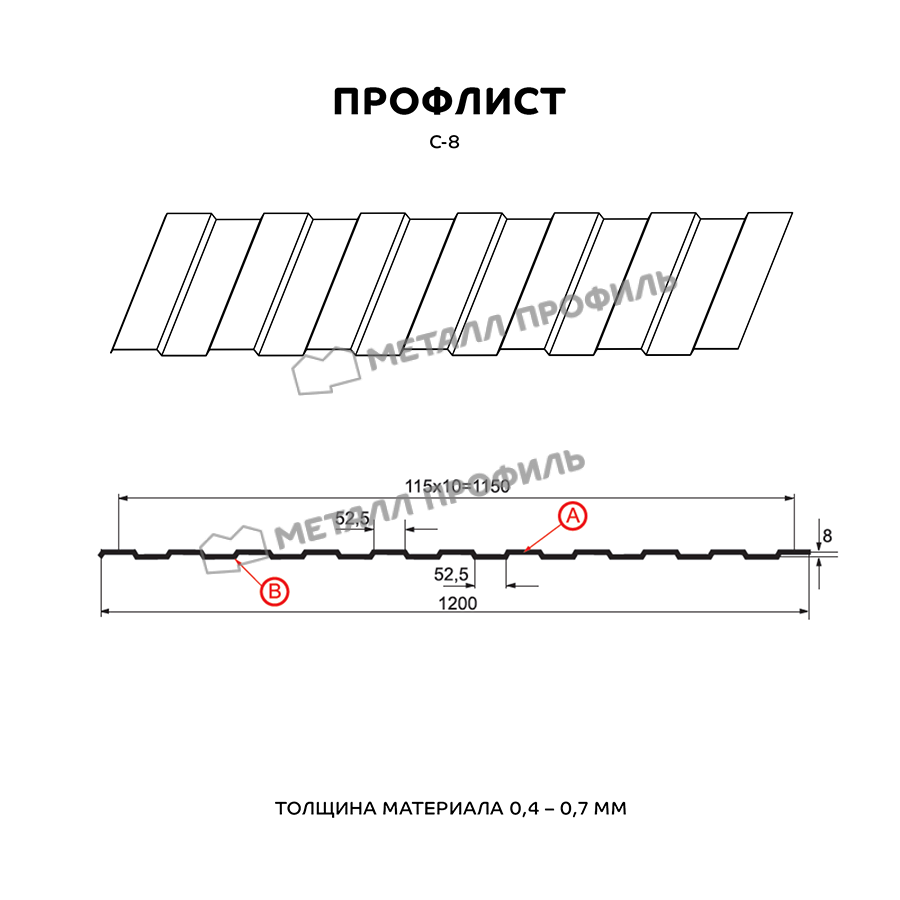 С-8 – самый низкий и экономичный профиль. Его несущая способность сравнительно невелика, в связи с этим данный профиль не применяется в сооружениях, где необходима высокая жёсткость. Чаще всего его используют в качестве стенового облицовочного материала, а также для возведения ограждений и подвесных потолков. Обладая маленькой высотой – всего 8 мм – одновременно он имеет самую большую рабочую ширину – 1150 мм. Чаще всего на изготовление С-8 идёт металлопрокат толщиной от 0,4 до 0,7 мм. Такой прочности стали будет достаточно для обшивки фасадов или устройства заборов в климатических зонах с низкой ветровой нагрузкой. Для вспомогательных конструкций (времянок, сараев, бытовок, туалетов) в Компании Металл Профиль можно купить оцинкованный профлист толщиной 0,35 и менее мм, чтобы не переплачивать без необходимости.