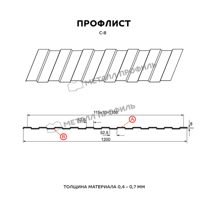 Профиль с наиболее маленькой волной в ассортименте Компании Металл Профиль. Его назначение – скорее декоративная функция, нежели несущая. Такой прокат отлично подходит для таких решений, как: постройка ограждений, не подверженных большим снеговым и ветровым нагрузкам, внутренняя облицовка промышленных строений, создание вентилируемых фасадов, системы подвесных потолков. Симметричная конфигурация профиля делает С-8 весьма удобным исходным материалом для разноплановых дизайнерских замыслов. Оптимальная толщина стали – от 0,4 до 0,7 мм даёт возможность профнастилу прекрасно справляться с любым своим назначением. А большая полезная ширина (1150 мм) помогает сэкономить на закупке профлистов. По вашему заказу мы можем изготовить листы металлопроката длиной от 0,5 до 12 метров.